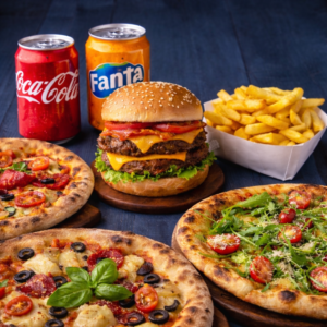 It is a unmissable family order, you can have 3 large pizzas with a double beeef burger 2 chips and 4 drinks (only cold drinks from our menu) and it is for pick up only